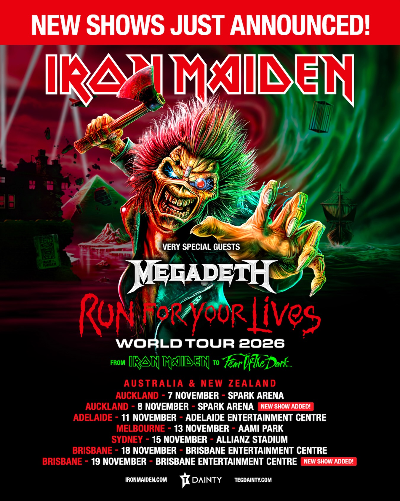 Tras el éxito inmediato en la preventa de boletos, la producción ha oficializado una segunda fecha en Brisbane y una noche adicional en Auckland. Estas incorporaciones responden al estatus de la gira como uno de los eventos musicales más esperados del año 2026, donde la banda conmemora su trayectoria interpretando un repertorio que abarca desde su álbum homónimo Iron Maiden hasta el icónico Fear of the Dark.
